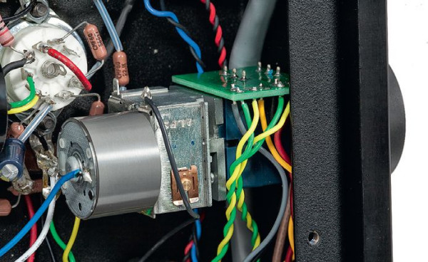 Widać bardzo dobre podzespoły pasywne (między innymi kondensatory Mundorf MCap). Sygnał jest jednak prowadzony "nienowocześnie": z gniazd RCA biegnie długimi odcinkami przewodów do mechanicznego selektora na przedniej ściance.