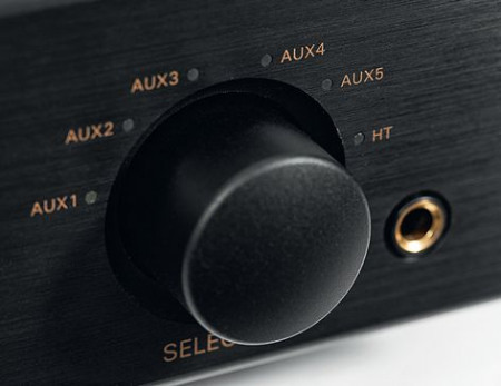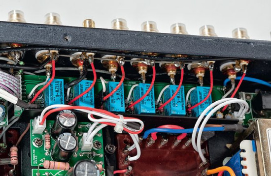 Przygotowano też nowoczesną aranżację selektora wejść. Gniazda RCA są podłączone za pomocą krótkich przewodów do niewielkiego modułu z przekaźnikami; pokrętło na przedniej ściance, którym wybieramy źródła, to jedynie sterownik wysyłający dalej rozkazy. Podobnie jest w przypadku pilota.