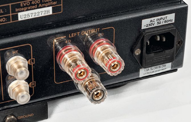 W ustawieniu Triode, Evo 400 powinien być zdolny oddać 38 W, a w konfiguracji UL – aż 70 W, zarówno przy 8 jak i 4 Ω. Dotyczy to zainstalowanych w testowanym egzemplarzu lamp EL34; dla KT88 moc ma być nieco wyższa (2 x 40 W/2 x 72 W, Triode/UL).