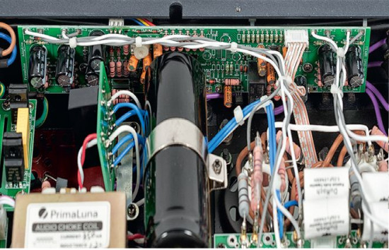 Wszystkie transformatory zostały ukryte pod obszerną, zajmującą niemal całą szerokość obudowy osłoną. Dostęp do poszczególnych podzespołów jest utrudniony, ale bazując na deklaracjach firmy donosimy, że transformator zasilający jest toroidalny, trafa wyjściowe (głośnikowe) są rdzeniowe – wszystkie wykonane samodzielnie przez PrimaLunę.