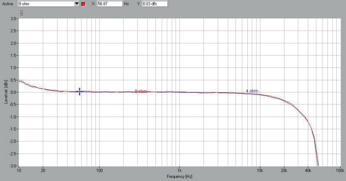 Czułość jest wysoka, do osiągnięcia mocy znamionowej wystarczy napięcie 0,31 V. Odstęp od szumów jest, jak na wzmacniacz lampowy, przyzwoity (-76 dB). Na charakterystykach częstotliwościowych (rys. 1) widać lekkie podniesienie w zakresie najniższych częstotliwości (+0,5 dB przy 10 Hz), a na drugim skraju -3 dB przy ok. 50 Hz.
