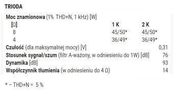 Słuchając z umiarkowanymi głośnościami, lepiej pozostać w trybie triodowym (chociaż ok. 40 W przy kolumnach o wysokiej efektywności to wcale niemało). Współczynnik tłumienia jest względnie (w tej grupie wzmacniaczy) wysoki (14), chociaż na tle wzmacniaczy tranzystorowych zdecydowanie niski.
