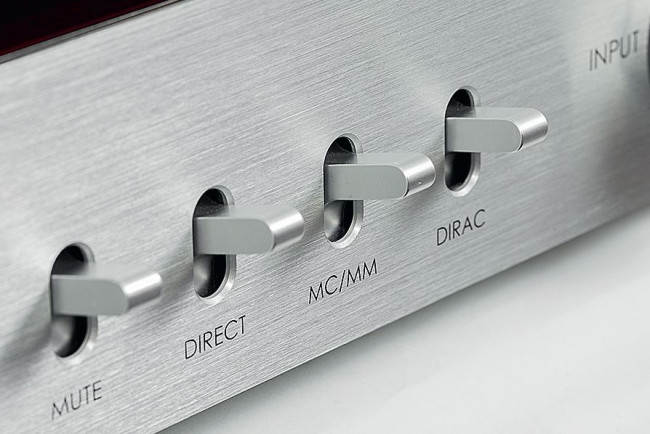 Są więc drewniane boczki, hebelkowe przełączniki, specyficzne pokrętła i ich rozmieszczenie, również gniazd. Hebelkami włączamy wzmacniacz i wybieramy dodatkowe funkcje, są tutaj opcje pracy przedwzmacniacza gramofonowego, jest tryb Direct, a nawet układ korekcji akustyki pomieszczenia.