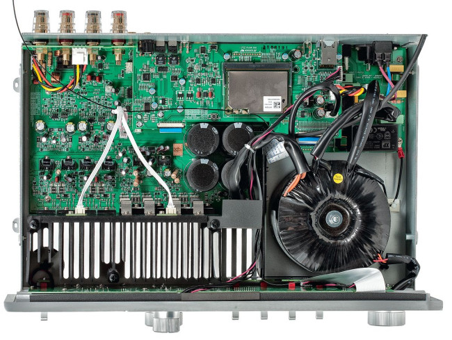 Transformator zasilający jest duży, toroidalny. W tylnej części obudowy widać rozbudowaną płytkę cyfrową z zaekranowanym głównym procesorem. Przetwornik cyfrowo-analogowy to znakomity ESS Sabre ESS9038 w wersji K2M, obsługujący PCM 32 bit/768 kHz oraz DSD512.