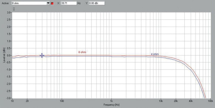 JBL przygotował specyfikację rzetelnie, określając moc przy obciążeniu obydwu kanałów, czyli 2 x 130 W przy 8 Ω oraz 2 x 200 W przy 4 Ω. Uzyskaliśmy bardzo podobne wyniki: odpowiednio 2 x 129 W oraz 2 x 207 W, dodając do tego pomiary przy jednym wysterowanym kanale, a wówczas jest to 153 W przy 8 Ω oraz 258 W przy 4 Ω.