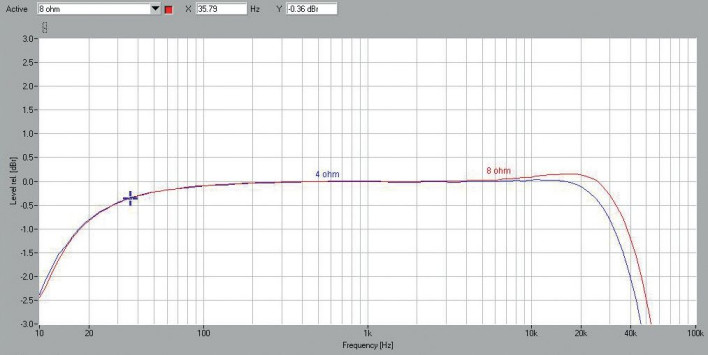 Rys. 1a pokazuje charakterystyki przenoszenia dwóch podstawowych obciążeń, 8 i 4 Ω. Przy 10 Hz spadek wynosi -2,5 dB, w zakresie wysokotonowym widać pewną przewagę 8 Ω, spadek 3 dB przy 52 kHz, a dla obciążenia 4 omowego – przy 46 kHz. Taka różnica nie jest jednak argumentem, aby unikać kolumn 4-omowych.