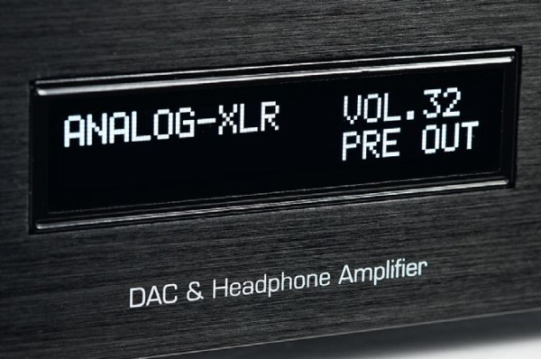 W górnym rzędzie matrycy pojawia się informacja o wybranym źródle oraz poziomie głośności, poniżej parametry sygnału (w przypadku wejść cyfrowych), symbol wybranego wyjścia i trybu wzmocnienia (w przypadku słuchawek).