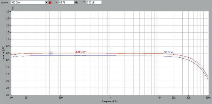 Charakterystyki przetwarzania (rys. 1) prezentują się bez zarzutu dla obydwu impedancji obciążenia. Przy 10 Hz nie widać żadnego spadku, a przy 100 kHz wynosi on zaledwie ok. -2 dB.