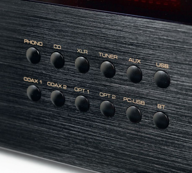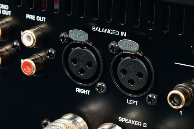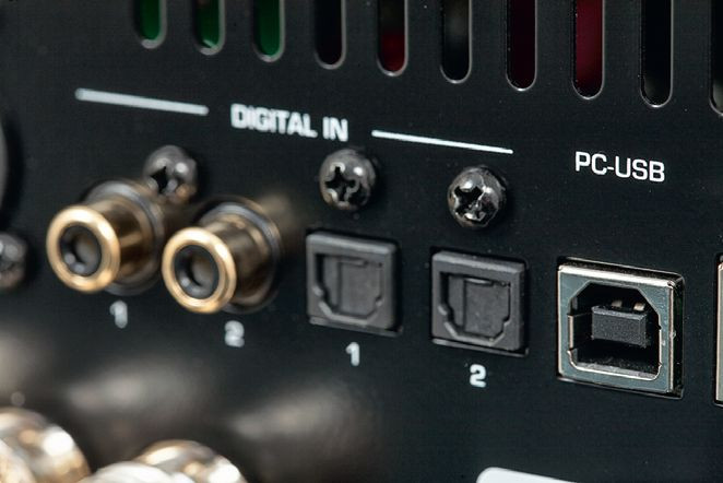 Sześć gniazd przyjmuje sygnały cyfrowe (dwa optyczne, dwa elektryczne współosiowe oraz dwa USB), pięć – analogowe (trzy pary RCA i jedna XLR dla sygnałów liniowych, jedna RCA dla gramofonu z wkładkami MM).