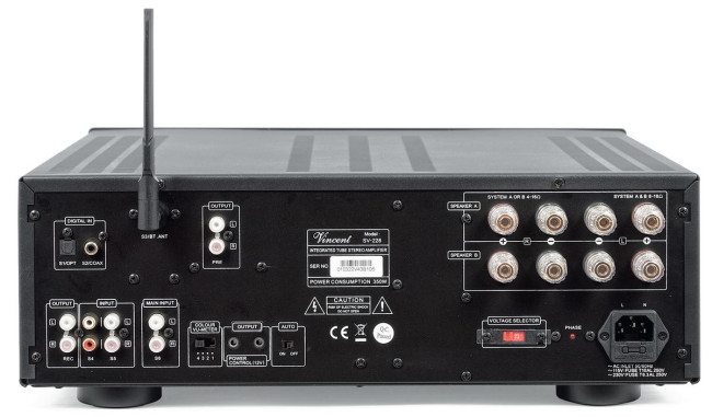 Vincent SV-228 pozwala podłączyć w sumie sześć źródeł sygnału – trzy cyfrowe i trzy analogowe – wliczając w to bezprzewodowy Bluetooth (jako jedno ze źródeł cyfrowych) i urządzenie podłączone bezpośrednio do końcówki mocy (a więc wyposażone w regulację poziomu).
