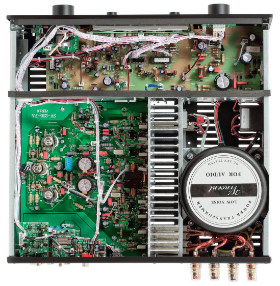 Wnętrze Vincenta SV-228 podzielono na trzy główne komory, metalowe płyty pełnią rolę ekranującą, delikatne obwody przedwzmacniacza zostały więc odseparowane od zasilacza oraz elektroniki sterującej, a transformator toroidalny zamknięto w dodatkowej puszcze.