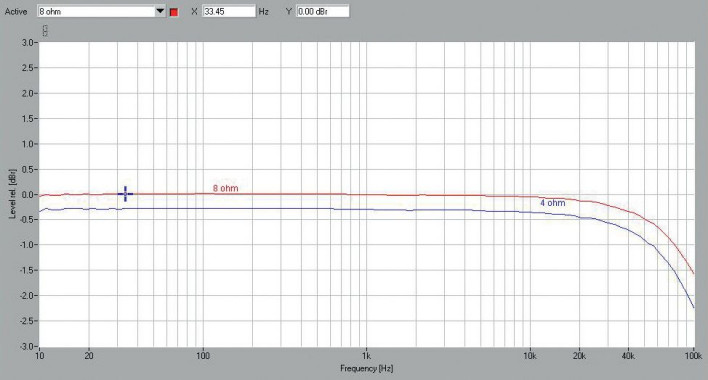 Mimo pracy lampowego przedwzmacniacza, szumy utrzymano na bardzo niskim poziomie –88 dB. Charakterystyki częstotliwościowe (rys. 1) również nie pozostawiają wiele do życzenia, przy 100 kHz spadki wynoszą -1,5 dB dla 8 Ω i -2 dB dla 4 Ω.