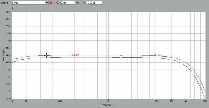 A wyniki są jeszcze lepsze – 2 x 65 W przy 8 Ω i aż 2 x 121 W przy 4 Ω, przy czym moc nie jest ograniczana ani o jotę przy wysterowaniu dwóch kanałów w porównaniu do jednego, mimo że nie jest to konstrukcja dual-mono.