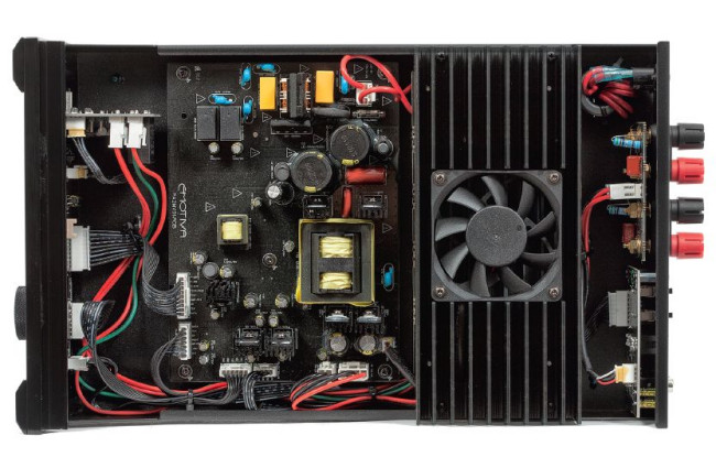 Chłodzenie wspomaga wentylator. Ścieżka sygnału faktycznie jest bardzo krótka. Końcówki są liniowe, pracują w klasie AB, jednak zasilacz jest impulsowy, co – jak się okaże w Laboratorium – zapewnia komfortowy rezerwuar mocy.