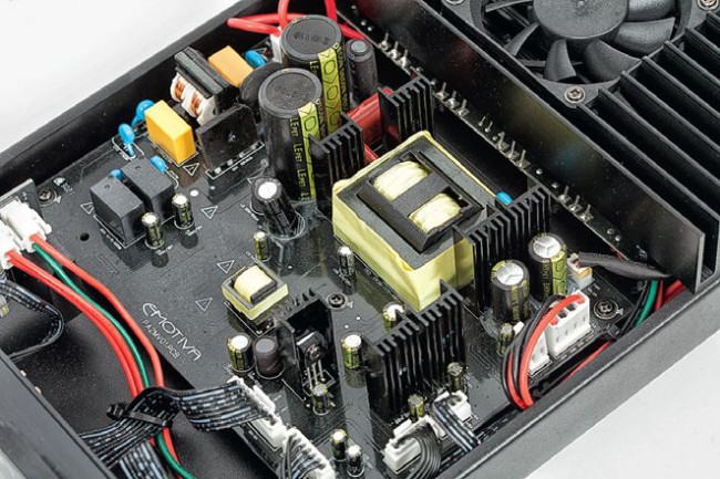 Wnętrze BasX A2m też wygląda niekonwencjonalnie. Gdyby "wyciąć" panel przyłączeniowy, trudno byłoby poznać, że to w ogóle wzmacniacz, a nie sprzęt do innych zadań. Cała sekcja audio znajduje się w tylnej części i jest w większości przykryta radiatorem.