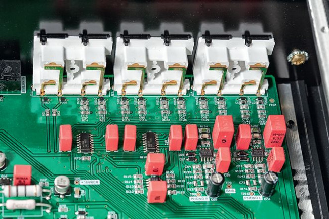 Lewą część opanował zasilacz z dużym transformatorem toroidalnym, prawą przeznaczono dla układów audio, z których większość obsadzono na jednej płytce drukowanej, choć jest też drugi, znacznie mniejszy moduł, ograniczony w zasadzie do regulatora głośności (potencjometr Alps), połączonego z główną płytką wielożyłową taśmy. Wybór źródeł odbywa się w układach scalonych.