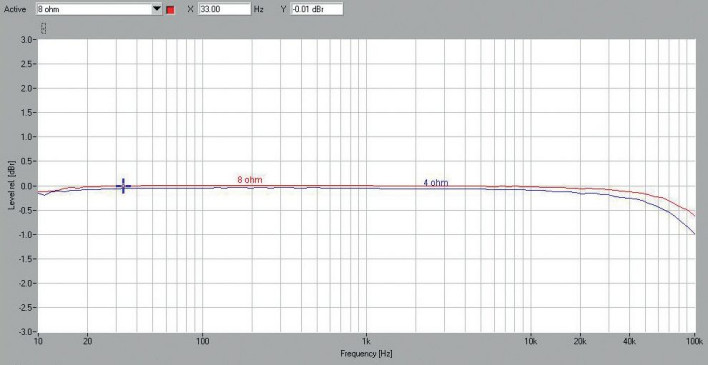 Charakterystyki częstotliwościowe (rys. 1) nie objawiają żadnej słabości, spadek przy 10 Hz jest śladowy, a przy 100 kHz też praktycznie nieistotny (-0,5 dB przy 8 Ω i -1 dB przy 4 Ω).