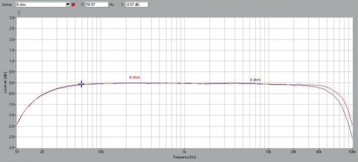 Nasz zakres pomiarowy jest ograniczony do 10 Hz – 100 kHz, więc nie powinniśmy w nim odnotować takich spadków… I nie odnotowujemy; przy 10 Hz i 100 kHz wynosi -1,8 dB dla 8 Ω i -2,6 dB dla 4 Ω (rys. 1). Charakterystyki dla obydwu obciążeń są niemal zbieżne.