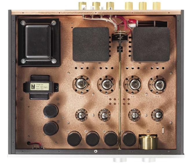 Patrząc od góry widzimy komplet lamp i transformatorów (zasilające, głośnikowe), jest tam też przełącznik źródeł – jeden z najbardziej niezwykłych elementów z punktu widzenia nowoczesnego wzmacniacza – to klasyczny, obrotowy "wybierak", umieszczony blisko tylnej ścianki.