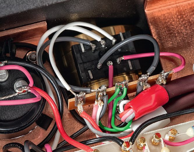 Pojawia się on w ścieżce sygnału jako pierwszy, do wybieraka przylutowano krótkie odcinki przewodów połączone ze znajdującymi się obok gniazdami RCA. Wyjście z selektora źródeł trafia już do solidnych, ekranowanych interkonektów, następnie sygnał nurkuje poprzez szczeliny do dolnej komory.