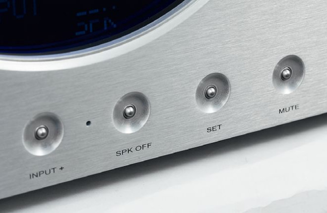 Źródła wybieramy dwoma przyciskami, pozostałe (na przedniej ściance) odpowiadają za kilka dodatkowych funkcji, między innymi odłączają wyjścia głośnikowe i wyciszają cały układ. Wszystkie ustawienia (oprócz głośności) są pokazywane na niebieskim wyświetlaczu.