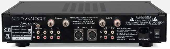 Symetryczne ustawienie gniazd głośnikowych na tylnym panelu zapowiada konfigurację dual mono (rozdzielenie torów kanału lewego i prawego), jednak nie ma z tym związku. Audio Analogue AAcento ma wyłącznie wejścia analogowe, ale ich różnorodność i powiązania układowe powinny każdego zadowolić.