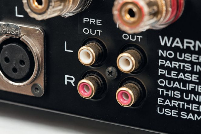 Mamy do dyspozycji cztery wejścia liniowe – trzy w standardzie RCA i jedno XLR-ów (ustalmy to już teraz – wzmacniacz nie jest układem zbalansowanym). Do tego dochodzi niezależne wejście gramofonowe (MM i MC). Sekcja wyjść (niskopoziomowych) obejmuje jedną parę RCA (jako wyjście stereo) oraz dwa gniazda (monofoniczne) dla subwooferów.