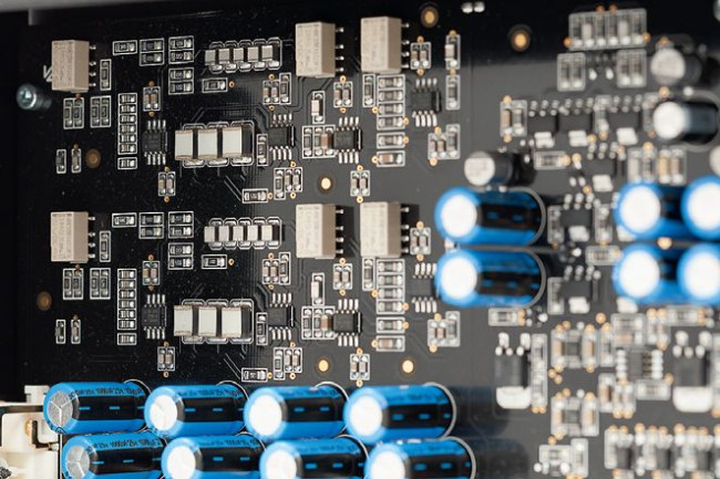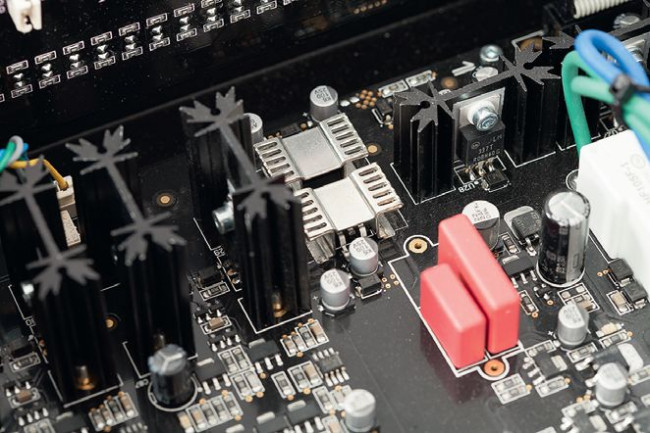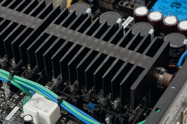 Środkową część konstrukcji zajmują dwa rozrośnięte bloki radiatorów. W dolnej części każdego z nich znajdują się dwie pary tranzystorów wyjściowych. Płytka z elektroniką wygląda nowocześnie; staranny projekt, precyzyjny montaż i elementy SMD zapewniły krótką ścieżkę sygnału i w konsekwencji niskie szumy.