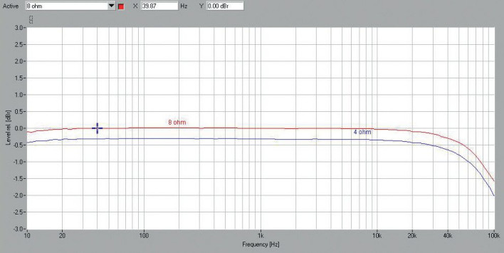 Zauważalna jest jednak różnica w poziomach między badanymi obciążeniami, związana z wysoką impedancją wyjściową. Wynosi ona 0,42 Ω (sam producent zadeklarował 0,4 Ω; różnica 5% nie ma tutaj żadnego znaczenia), co oznacza bardzo niski współczynnik tłumienia – 10, występujący raczej we wzmacniaczach lampowych.
