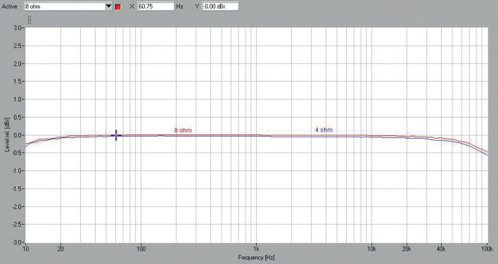Wygląda na to, że lampy nie mają też poważnego (negatywnego) wpływu na charakterystyki częstotliwościowe (rys. 1); spadek przy 10 Hz wynosi -0,3 dB, a przy 100 kHz ok. -0,5 dB.