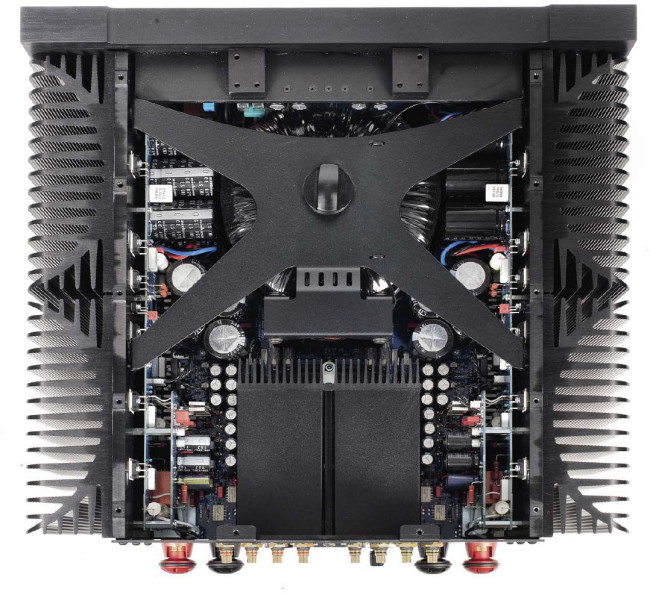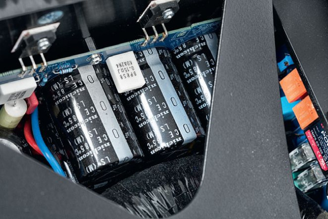 W każdym kanale pracuje aż dwanaście bipolarnych par Toshiba 2SA-1943/2SC200. Umieszczono je na grubych płytach bocznych, a dopiero do nich dokręcono radiatory.
