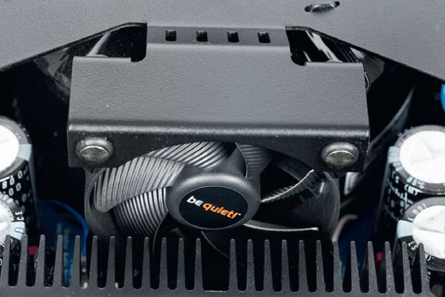 Znajdujący się tuż obok wentylator kieruje strumień powietrza właśnie w tę stronę, pracuje jednak bez względu na to, czy moduły są zainstalowane w sposób ciągły, po włączeniu zasilania. W centralnej części śmigiełka widnieje napis "be Quiet!" – faktycznie wentylator jest absolutnie bezgłośny.