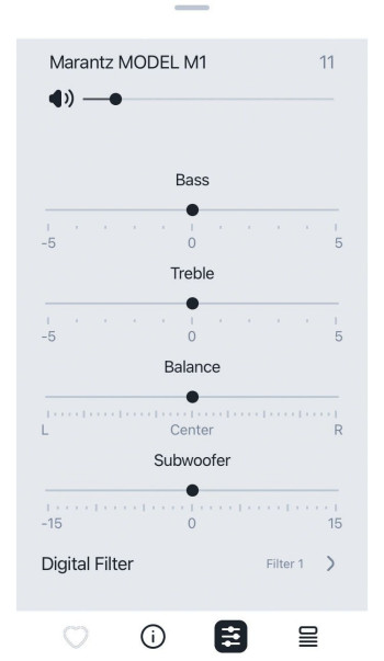 Ze spraw związanych z dźwiękiem mamy do dyspozycji między innymi podstawową korekcję barwy, sekcję subwooferową, są też dwa warianty filtrów cyfrowych; producent nie definiuje ich charakterystyk, ale chwali się, że M1 ma autorskie układy Marantz Music Digital Filtering (MMDF) zaszyte w sekcji DSP.