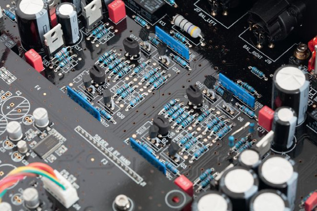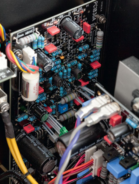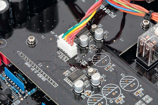 Większość układów ulokowano na jednej dużej płytce drukowanej, kilka mniejszych (między innymi regulatory głośności) wydzielono, a obwody sterujące odsunięto od toru audio.