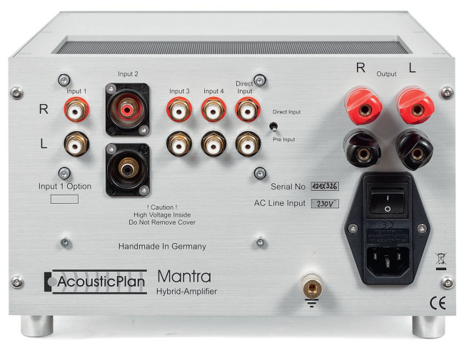 Tylna ścianka wzmacniacza Acoustic Plan Mantra jest "elastyczna". Miejsca montażowe na gniazda przygotowano w taki sposób, aby można było część z nich zastąpić innymi, instalując wewnątrz dodatkową elektronikę. O miejscu produkcji jednoznacznie świadczy napis "Handmade In Germany".