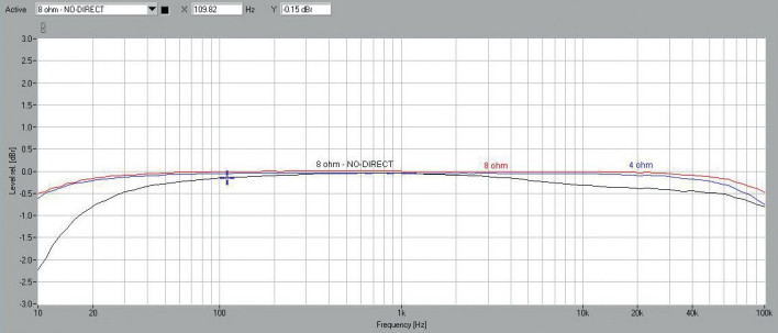 Rysunek z charakterystykami przetwarzania (rys. 1) jest tym razem bogatszy o dodatkowe pomiary. W trybie Direct, zarówno przy 8 Ω (krzywa czerwona), jak i 4 Ω (krzywa niebieska) wzmacniacz spisuje się znakomicie, spadki na skrajach mierzonego pasma są rzędu kilku dziesiątych decybela.