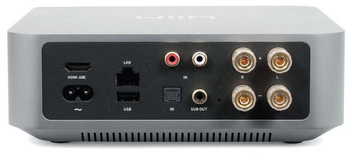 Na tylnej ściance WiiM Amp Pro nie ma wiele miejsca, ale zmieściło się wszystko, co nowoczesne i niezbędne. Gniazda głośnikowe są pojedyncze, jest jedno wejście analogowe (liniowe) i kilka cyfrowych: optyczne, HDMI eARC (nawet z dekodowaniem Dolby Digital, oczywiście sumuje później sygnał do dwóch kanałów) oraz USB; z tego ostatniego ściągniemy pliki muzyczne, ale nie podłączymy tym sposobem komputera (w formule DAC).Jest wyjście subwooferowe (i to z regulacją poziomu i częstotliwości filtrowania).