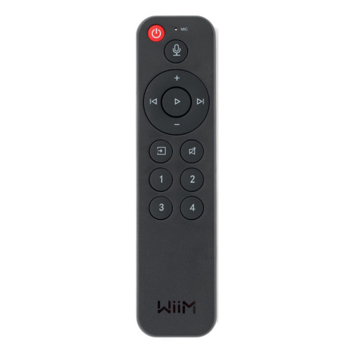 Na froncie WiiM Amp PRO dominuje pokrętło – nowoczesny manipulator, oprócz regulacji głośności pełniący kilka innych zadań (związanych głównie, choć nie tylko, z odtwarzaniem).