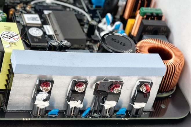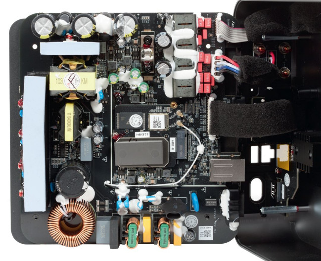 Końcówki mocy, z uwagi na wielkość obudowy, to o czywiscie układy impulsowe Moduł Texas Instruments TPA3255 jest właściwie gotową, dwukanałową końcówką mocy. Jej parametry są imponujące: moc wyjściowa sięga 2 x 150 W przy 8 Ω i 2 x 260 W przy 4 Ω, czego WiiM w pełni nie wykorzystuje, konfigurując końcówki tak, aby uzyskać odpowiednio 2 x 60 W i 2 x 120 W.