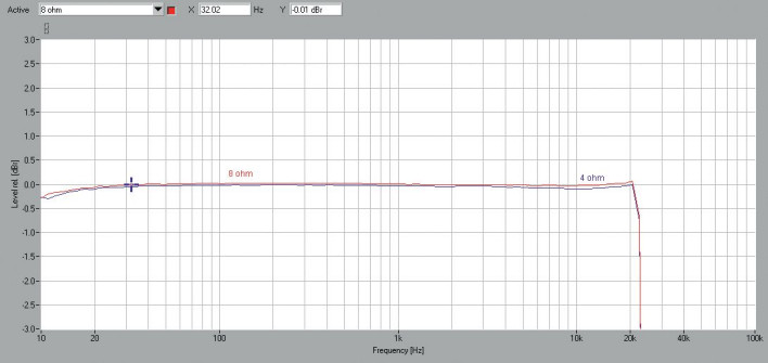 Charakterystyki na rys. 3. prezentują się dobrze, THD+N leżą poniżej granicy 0,1% niemal w całym badanym zakresie, począwszy od najniższych wartości mocy wyjściowych.