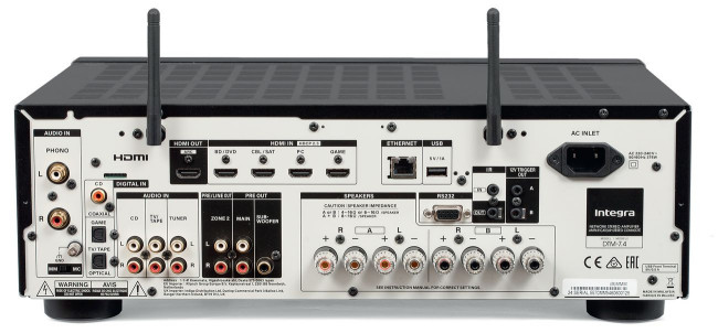 Integra DTM-7.4 ma rekordową liczbę wejść i wyjść w najróżniejszych standardach. Przeważają cyfrowe w dwóch głównych grupach. Pierwszą tworzy sekcja HDMI z czterema wejściami i jednym wyjściem (z kanałem zwrotnym ARC), w drugiej są dwa złącza optyczne i jedno współosiowe. Do tego dochodzi jeszcze gniazdo USB (dublujące funkcje frontowego, nie ma USB-DAC).