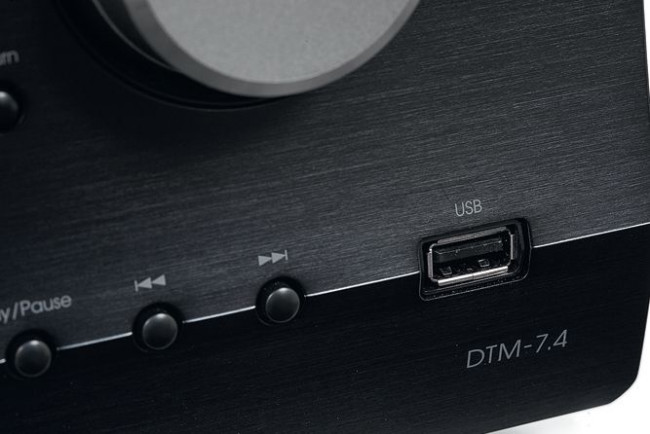 Są przyciski do uruchomienia zdalnej strefy, wielofunkcyjne pokrętło i nawigacja po menu ustawień, które może się też przydać w stereo, tym bardziej, że mamy strumieniowanie – w tej grupie tylko w DTM-7.4. Na froncie jest też wyjście słuchawkowe (6,3 mm) oraz gniazdo USB (dla nośników pamięci z muzyką).