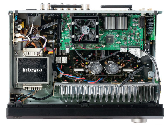 Układ wnętrzaIntegra DTM-7.4 zdradza ogólne podobieństwa do amplitunerów A/V, mimo że są tylko dwa kanały. Typowo rozplanowano poszczególne moduły, a w przedniej części obudowy znajduje się duży radiator. Końcówka mocy składa się z dwóch tranzystorów na kanał, widać także bardziej rozbudowany, niż zwykle, zasilacz.