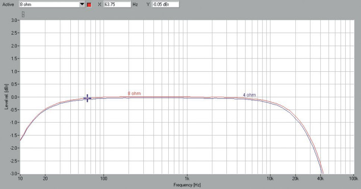 Zaczynamy tradycyjnie od 8 Ω, notując 64 W i 2 x 56 W, czyli więcej niż zapowiada Rega. Przy 4 Ω moc wzrasta aż do 110 W przy jednym kanale wysterowanym i 2 x 89 W przy dwóch. Poprzednia wersja Brio miała moc 2 x 51 W przy 8 Ω i 2 x 72 W przy 4 Ω; Mk7 jest znacznie mocniejszy i w rzeczywistości nie boi się 4 Ω.