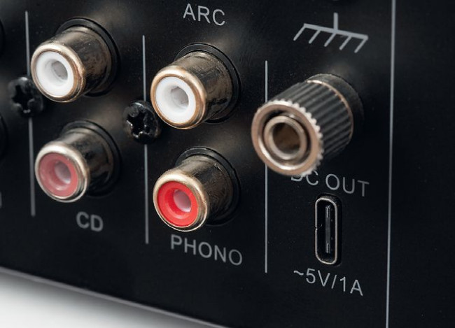 Oprócz wejść analogowych (RCA) jest także wyjście z przedwzmacniacza, jak sugeruje producent – do bi-ampingu; nie ma natomiast wyjścia o stałym poziomie napięcia. Gniazdo USB-C to tylko źródło zasilania (producent nie wyjaśnia do czego może się przydać).