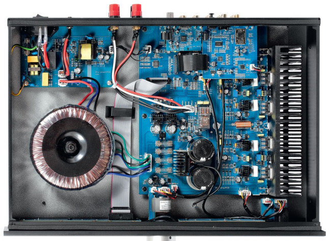 Zasilacz oparto na dużym transformatorze toroidalnym (wraz z mniejszą sekcją czuwania). Większość obwodów analogowych (wraz z kondensatorami zasilania wygładzającymi napięcie) znajduje się na dużej poziomej płytce.