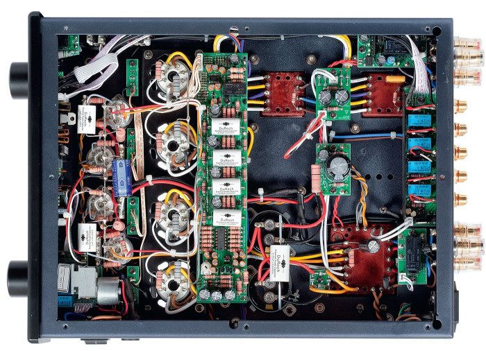 Moduł selektora źródeł zajmuje niewielką płytkę w pobliżu tylnej ścianki, a elementami kierującymi sygnał z poszczególnych gniazd RCA są przekaźniki. Dalej sygnały płyną w okolice przedniej ścianki do regulatora głośności, którym jest "niebieski" potencjometr firmy Alps. Stąd blisko już do lampowej sekcji i pierwszego stopnia wzmocnienia.