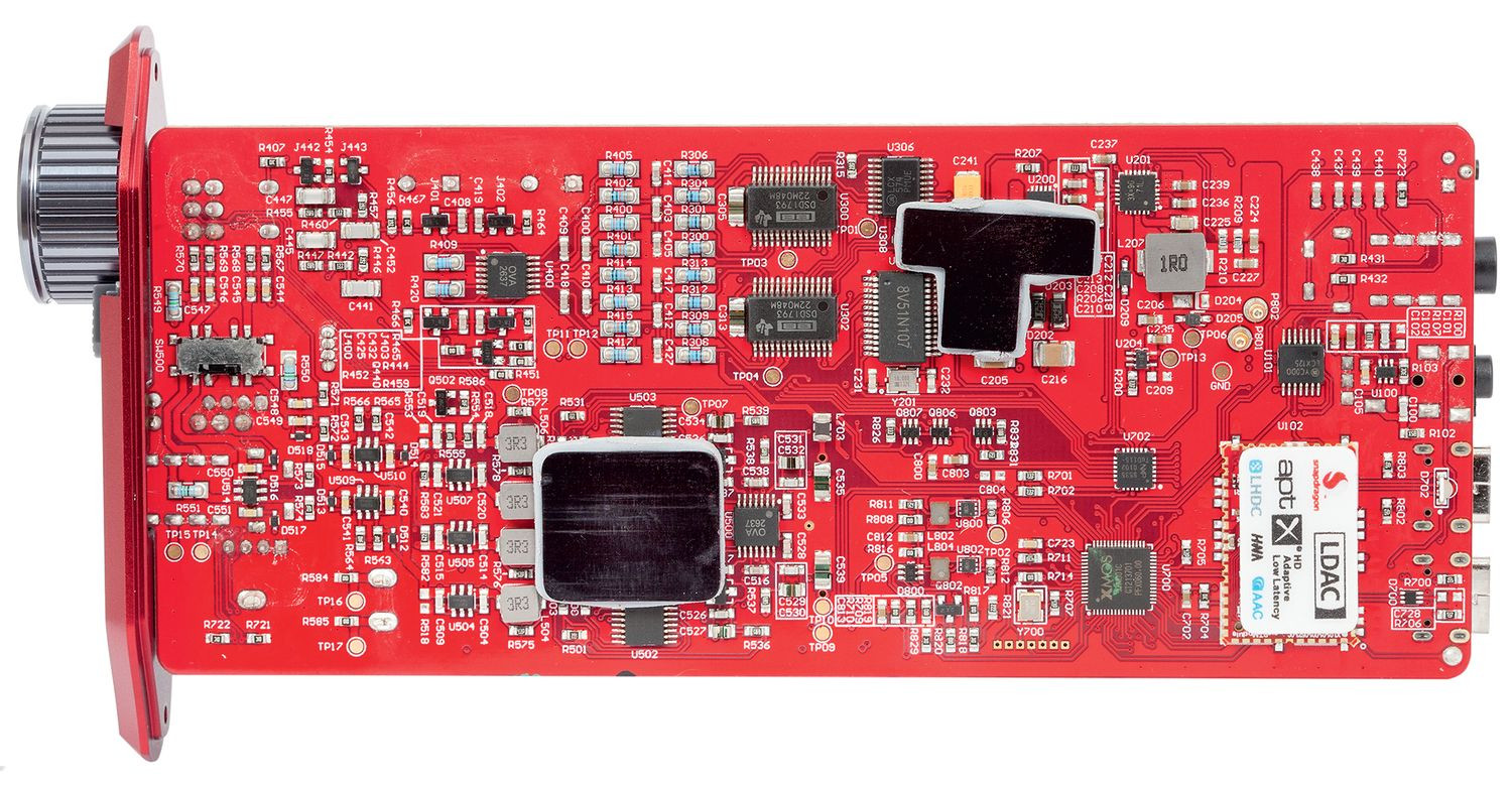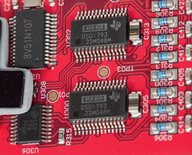 Wejście USB obsługuje jak zwykle układ XMOS, a konwersją cyfrowo-analogową zajmują się jedne z ulubionych kości iFi Audio – Texas Instruments DSD1793 (po jednym na kanał). To konwertery z 2003 roku o umiarkowanej dynamice 113 dB, ofi cjalnie akceptujące sygnały PCM 24/192 oraz DSD64. iFi Audio po raz kolejny, tylko sobie znanym sposobem, zmusiło je do pracy w trybie PCM 32/768 i DSD512.