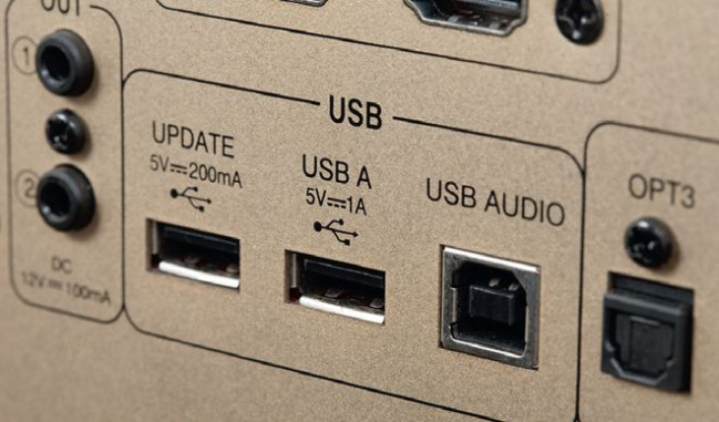 W części cyfrowej mamy trzy wejścia optyczne, jedno współosiowe, USB w formule USB-DAC (przyjmuje sygnały PCM 32 bit/384 kHz i DSD256) oraz USB-A (dla nośników pamięci, ale obsługiwane są tylko pliki MP3).