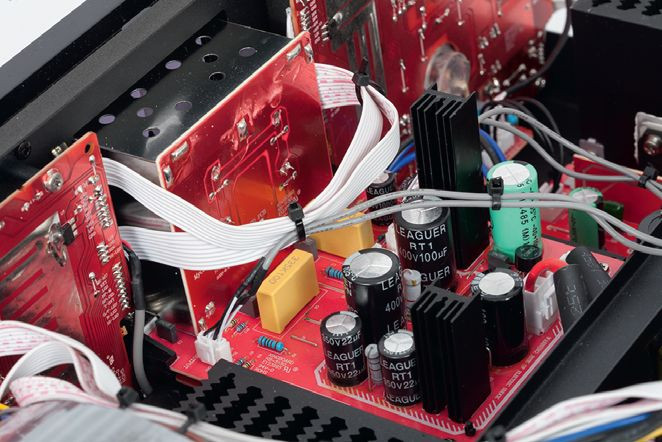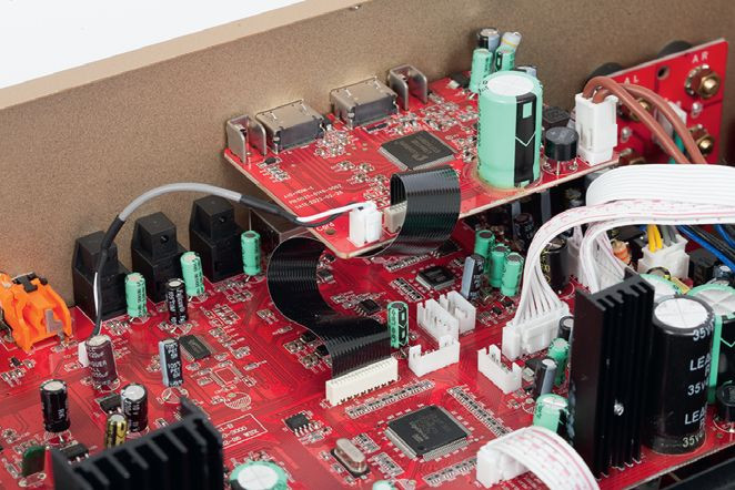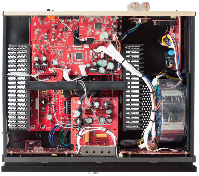 Część cyfrowa została ulokowana na górnym pokładzie, nad końcówkami. Znajdujemy tutaj przetwornik ESS Technology ES9018 (taki sam jak w Arcamie i Marantzu); producenci wciąż lubią ten układ, ma wystarczające parametry, a przede wszystkim dobrze brzmi.
